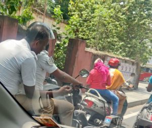 இருசக்கர வாகனத்தில் செல்லும் போது பின்னால் உட்கார்ந்து இருப்பவரும் ஹெல்மெட் உபயோகிக்க வேண்டும் என்பது சட்டம்.